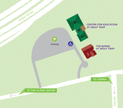 For patrons using a taxi or rideshare for drop-off or pick-up at the Center for Education, note The Barns at Wolf Trap is located beside the building. Occasionally it is easier for GPS to navigate to The Barns address: 1635 Trap Road, Vienna, VA 22182. Request your driver to proceed past The Barns to locate the Center for Education.